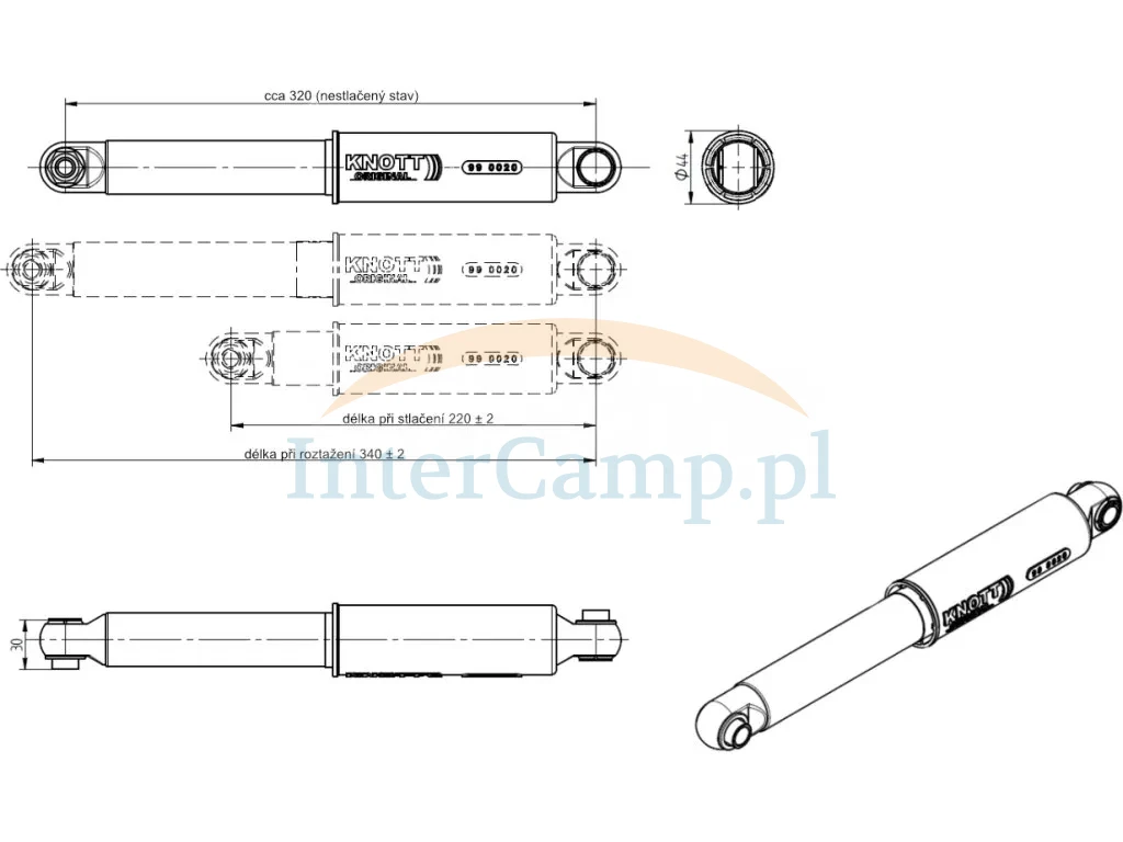 Amortyzator osi (tłumik drgań) do hamowanych osi przyczep, stosowany m.in. w podwoziach KNOTT w przyczepach kempingowych oraz przyczepach towarowych. Ogranicza podskakiwanie kół i „bujanie” przyczepy, poprawia stabilność zestawu i komfort jazdy, szczególnie przy wyższych prędkościach.