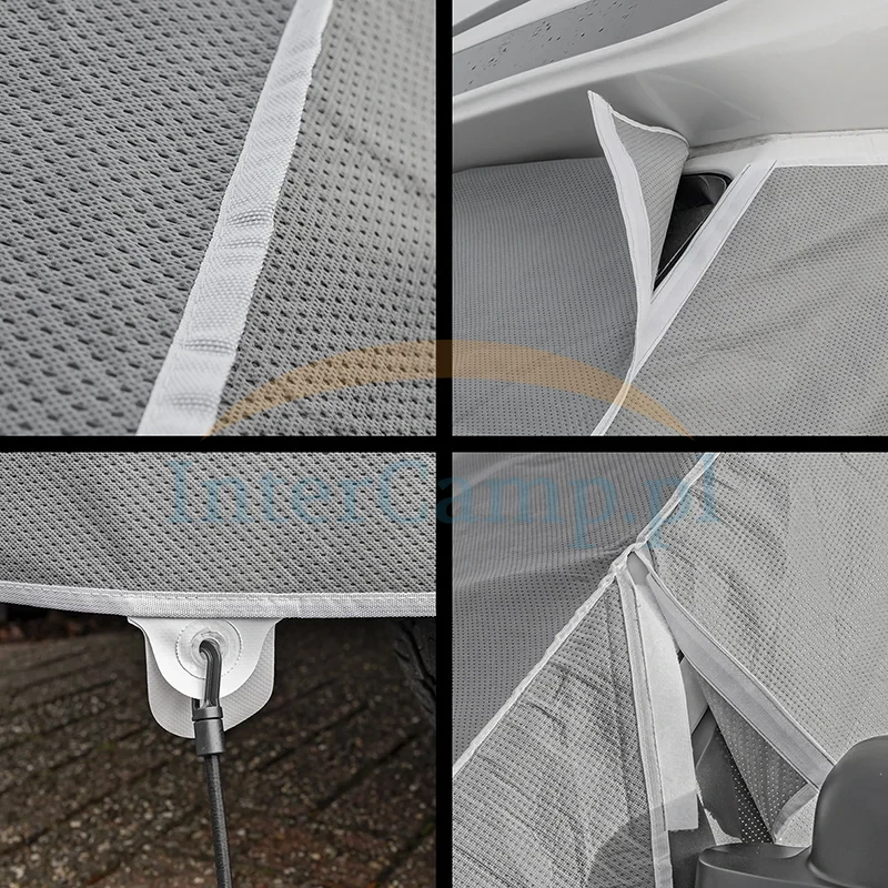 Osłona jest przeznaczona do użytku zewnętrznego podczas postoju na kempingu, pod domem lub w czasie zimowania pojazdu. Pomaga ograniczyć nagrzewanie kabiny, osadzanie się brudu na szybie oraz wpływ opadów i promieniowania słonecznego na przednią część kampera.