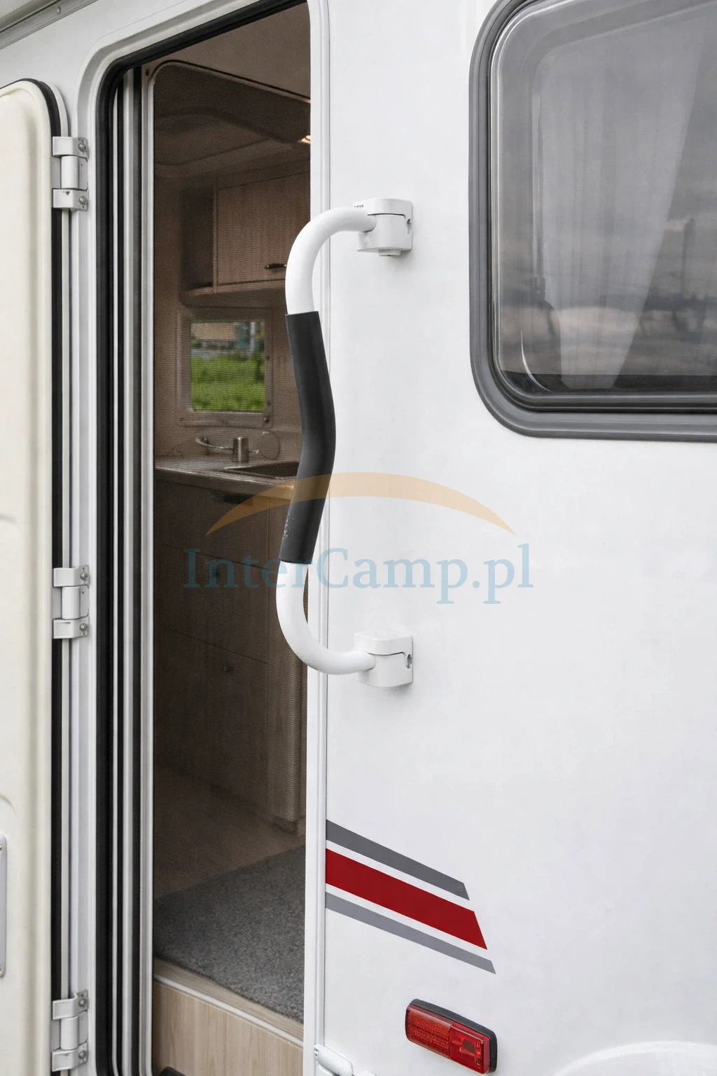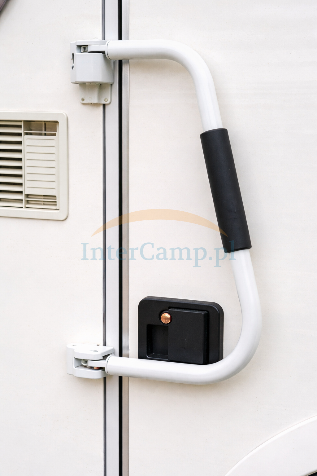 Safe Handgrip to zewnętrzny uchwyt wejściowy z funkcją dodatkowego zabezpieczenia drzwi do kampera lub przyczepy kempingowej. Łączy wygodniejsze wsiadanie z blokadą ograniczającą dostęp z zewnątrz.