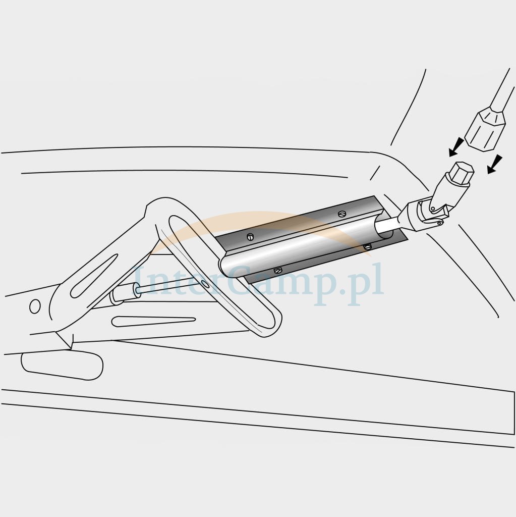 Wspornik przegubu uniwersalnego, m.in. H. Plastikowa rurka prowadząca jest wyraźnie widoczna. Nie ma klęczącego szukania gniazda sześciokątnego, nie klęczącej operacji podpory za pomocą korby.
