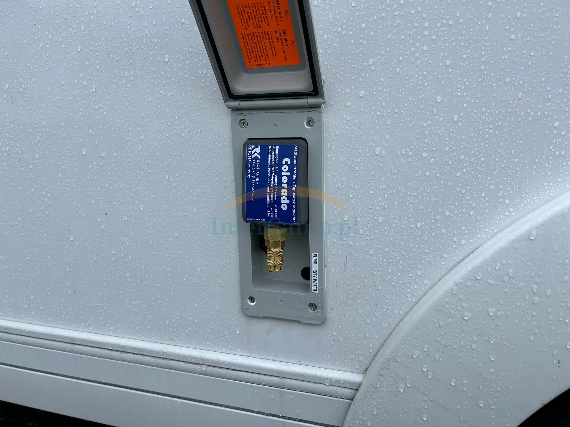 Reich to zewnętrzny regulator ciśnienia wody („City‑Water Regulator Colorado”) do bezpośredniego podłączenia publicznego przyłącza wodnego do instalacji wodnej kampera lub przyczepy. Urządzenie redukuje zbyt wysokie ciśnienie wejściowe (do 12 bar) do bezpiecznego poziomu 0,7 bar, oraz automatycznie odcina dopływ po osiągnięciu ciśnienia zamknięcia (1,1 bar), chroniąc wnętrze pojazdu przed uszkodzeniami i zalaniem.